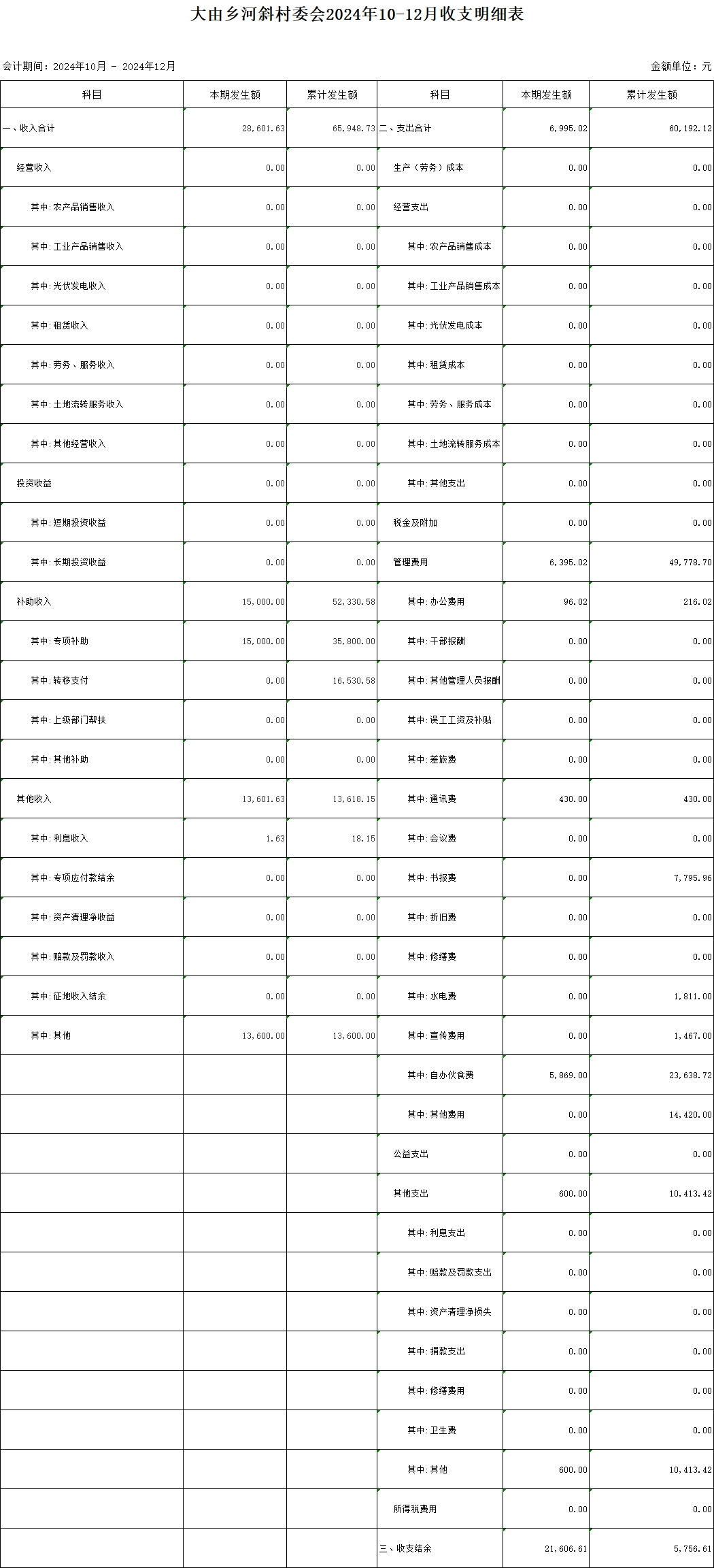 大由鄉(xiāng)河斜村委會(huì)2024年10-12月收支明細(xì)表