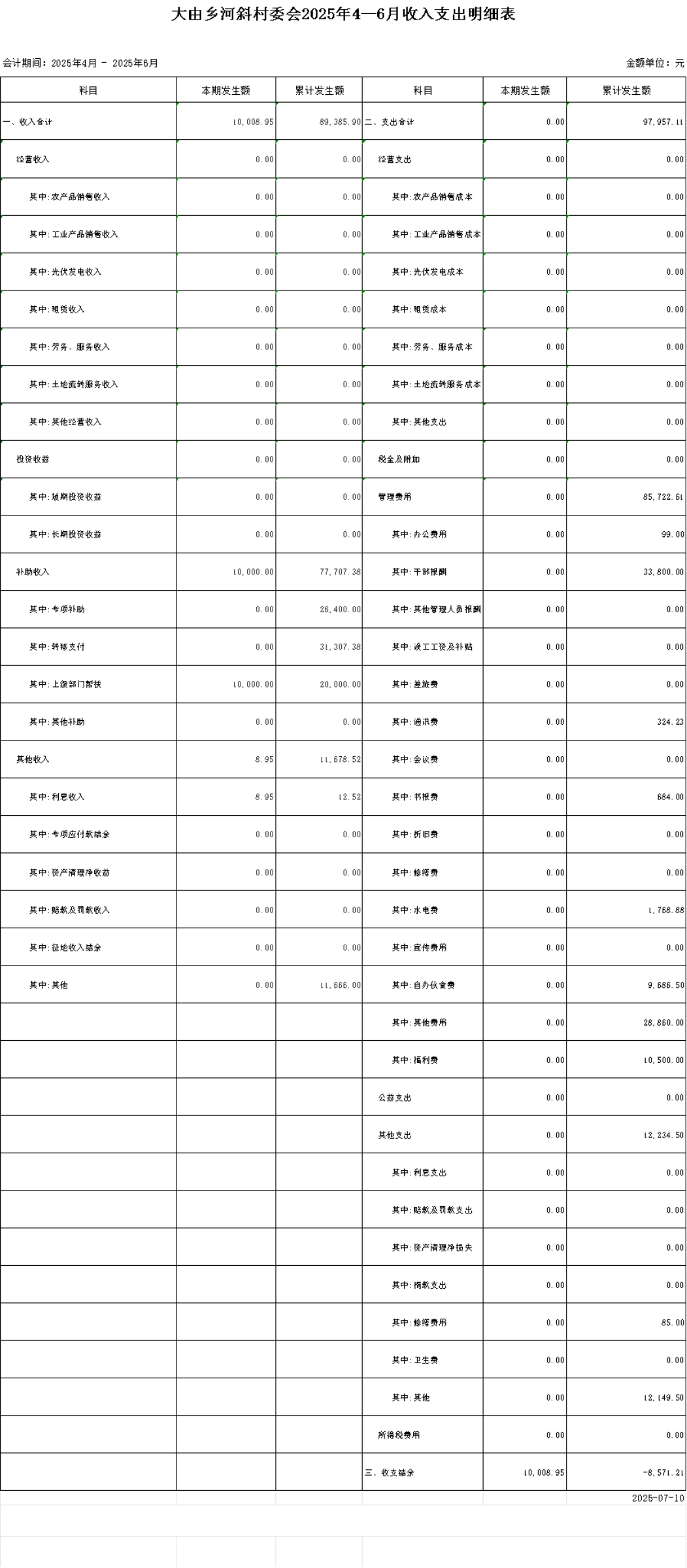 大由鄉(xiāng)河斜村委會(huì)2025年4—6月收入支出明細(xì)表