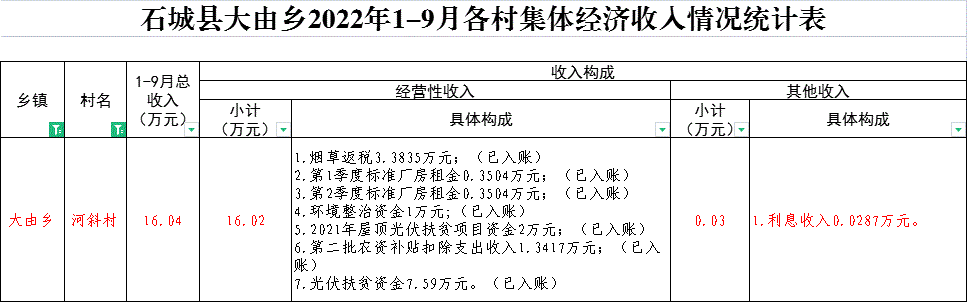 石城縣大由鄉(xiāng)2022年1-9月河斜村集體經(jīng)濟收入情況統(tǒng)計表