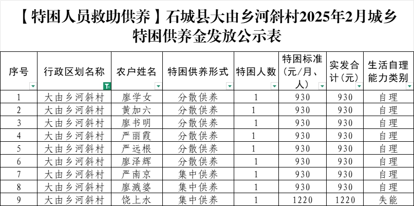 【特困人員救助供養(yǎng)】石城縣大由鄉(xiāng)河斜村2025年2月城鄉(xiāng)特困供養(yǎng)金發(fā)放公示表