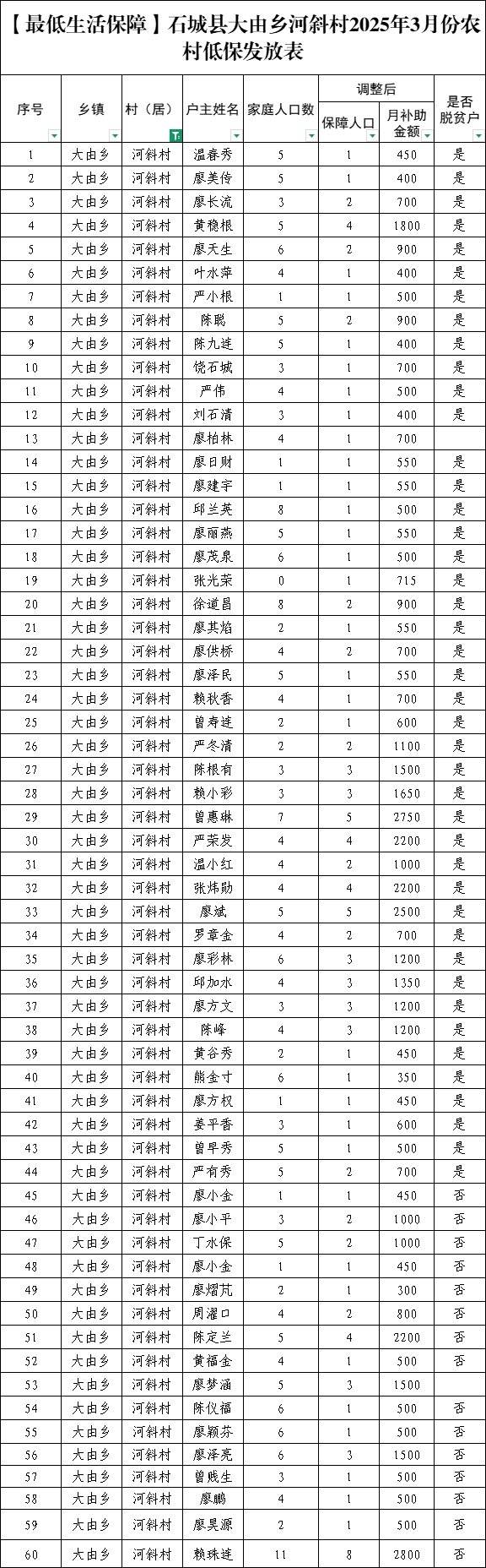 【最低生活保障】石城縣大由鄉(xiāng)河斜村2025年3月份農(nóng)村低保發(fā)放表