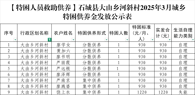 【特困人員救助供養(yǎng)】石城縣大由鄉(xiāng)河斜村2025年3月城鄉(xiāng)特困供養(yǎng)金發(fā)放公示表