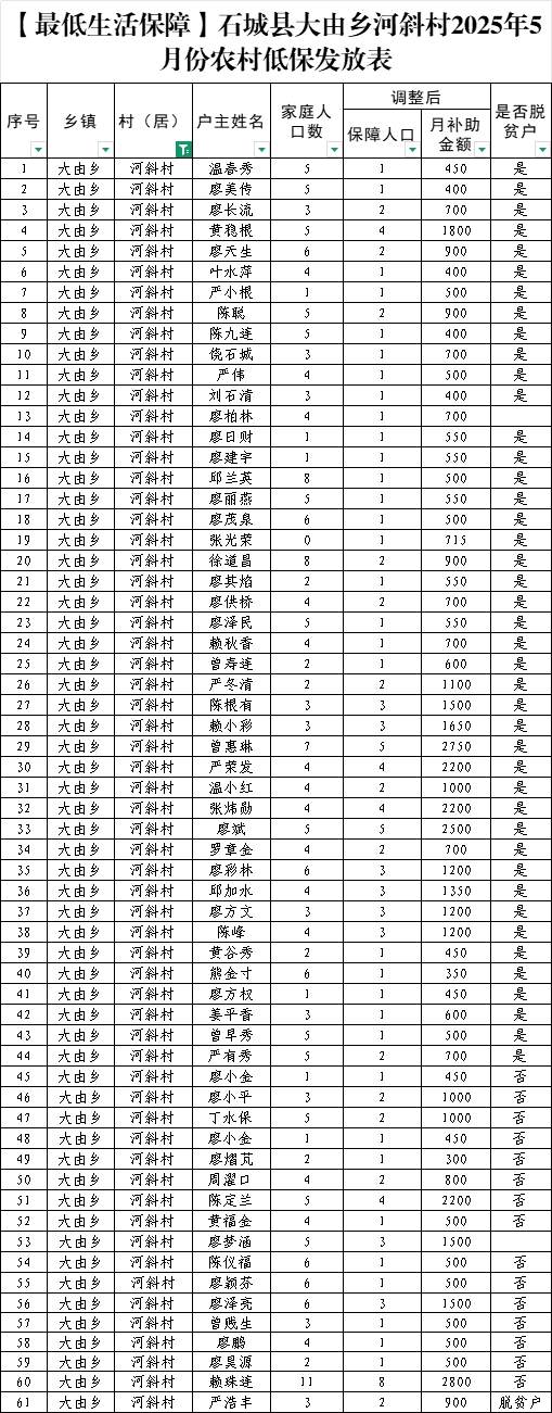 【最低生活保障】石城縣大由鄉(xiāng)河斜村2025年5月份農(nóng)村低保發(fā)放表