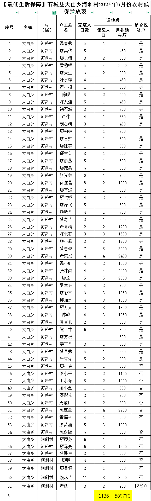 【最低生活保障】石城縣大由鄉(xiāng)河斜村2025年6月份農(nóng)村低保發(fā)放表