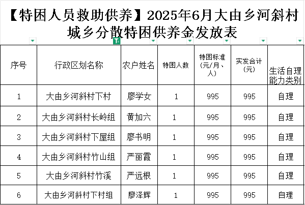 【特困人員救助供養(yǎng)】2025年6月大由鄉(xiāng)河斜村城鄉(xiāng)分散特困供養(yǎng)金發(fā)放表