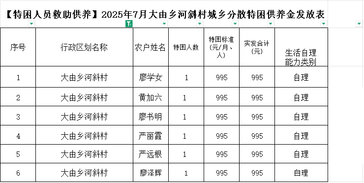 【特困人員救助供養(yǎng)】2025年7月大由鄉(xiāng)河斜村城鄉(xiāng)分散特困供養(yǎng)金發(fā)放表