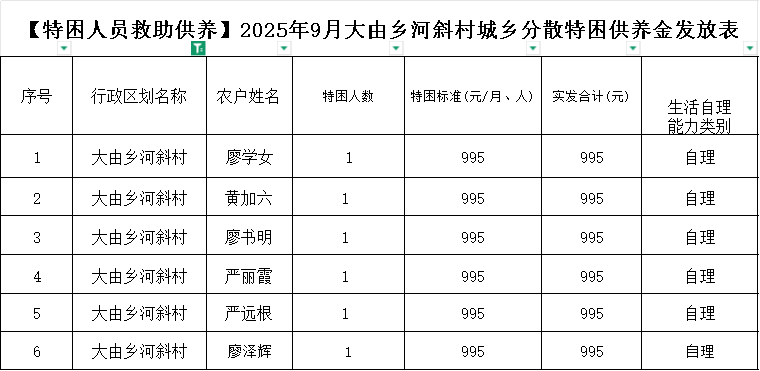【特困人員救助供養(yǎng)】2025年9月大由鄉(xiāng)河斜村城鄉(xiāng)分散特困供養(yǎng)金發(fā)放表