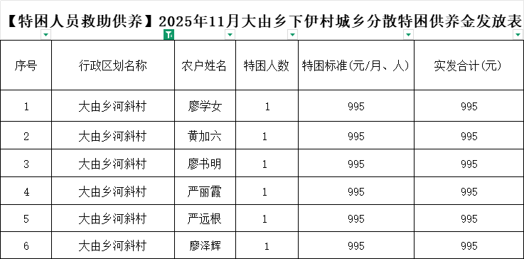 【特困人員救助供養(yǎng)】2025年11月大由鄉(xiāng)下伊村城鄉(xiāng)分散特困供養(yǎng)金發(fā)放表