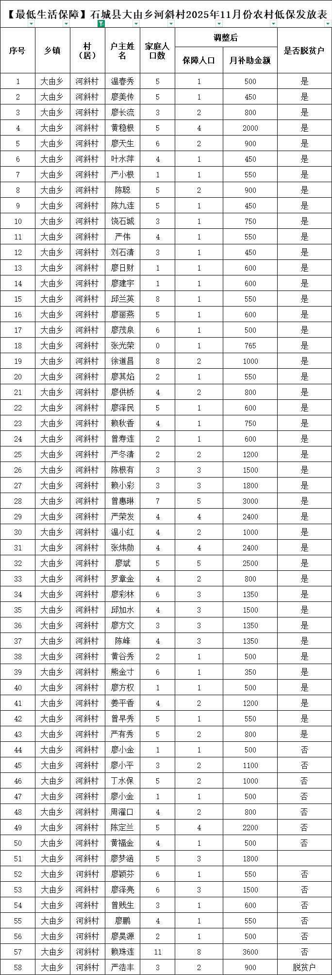【最低生活保障】石城縣大由鄉(xiāng)河斜村2025年11月份農村低保發(fā)放表