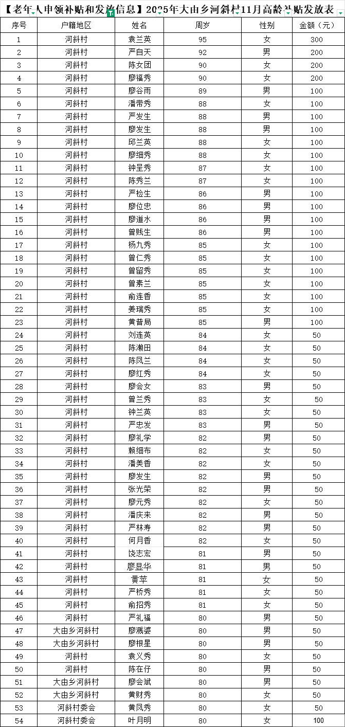 【老年人申領(lǐng)補(bǔ)貼和發(fā)放信息】2025年大由鄉(xiāng)河斜村11月高齡補(bǔ)貼發(fā)放表