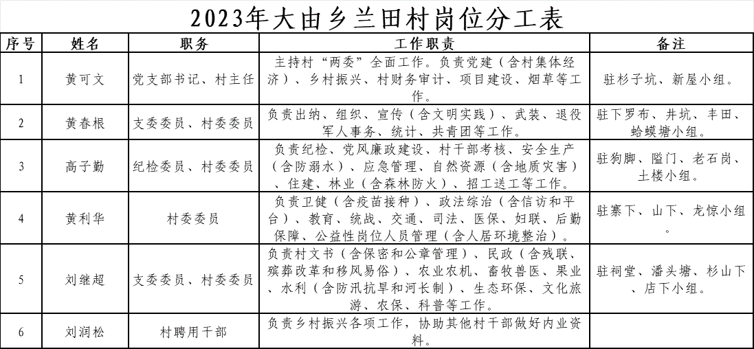 2023年大由鄉(xiāng)蘭田村崗位分工表
