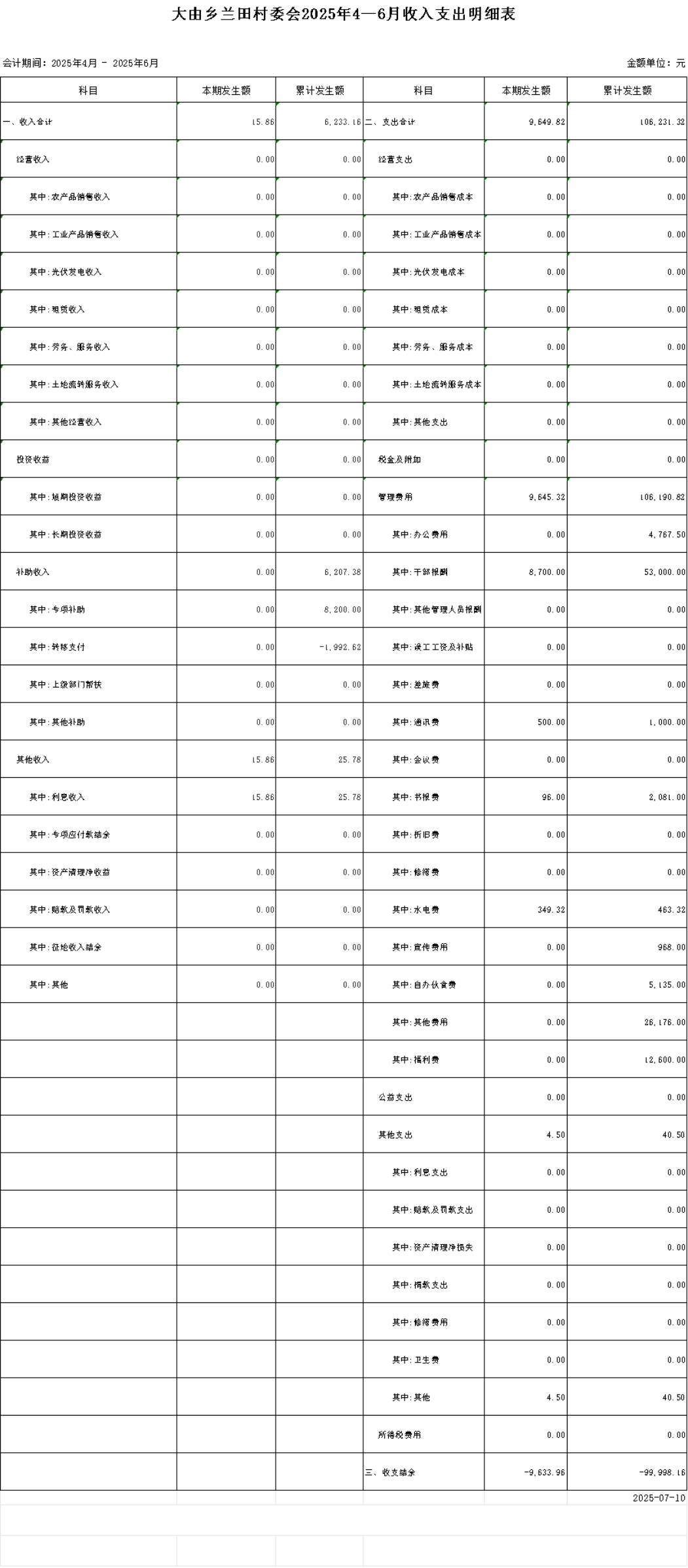 大由鄉(xiāng)蘭田村委會2025年4—6月收入支出明細表