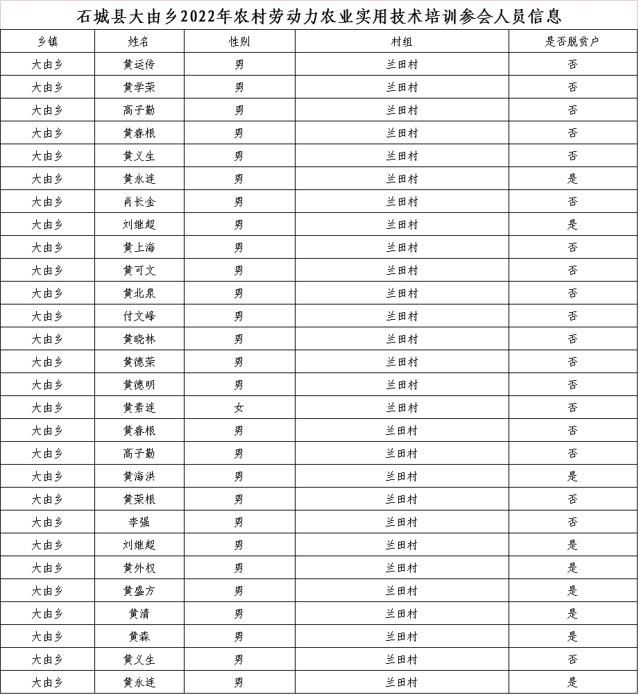 石城縣大由鄉(xiāng)蘭田村2022年農(nóng)村勞動(dòng)力農(nóng)業(yè)實(shí)用技術(shù)培訓(xùn)參會(huì)人員信息