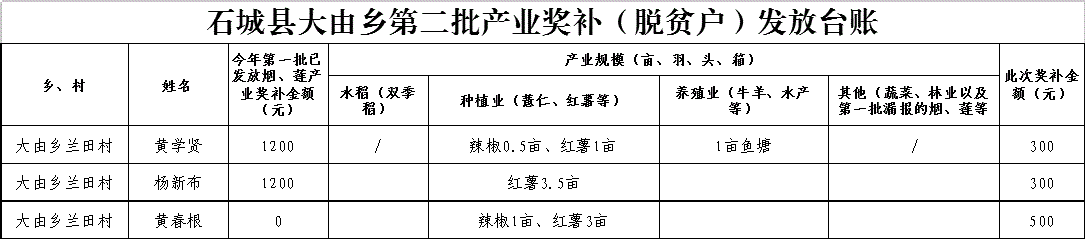 石城縣大由鄉(xiāng)蘭田村第二批產(chǎn)業(yè)獎補(bǔ)(脫貧戶)發(fā)放臺賬