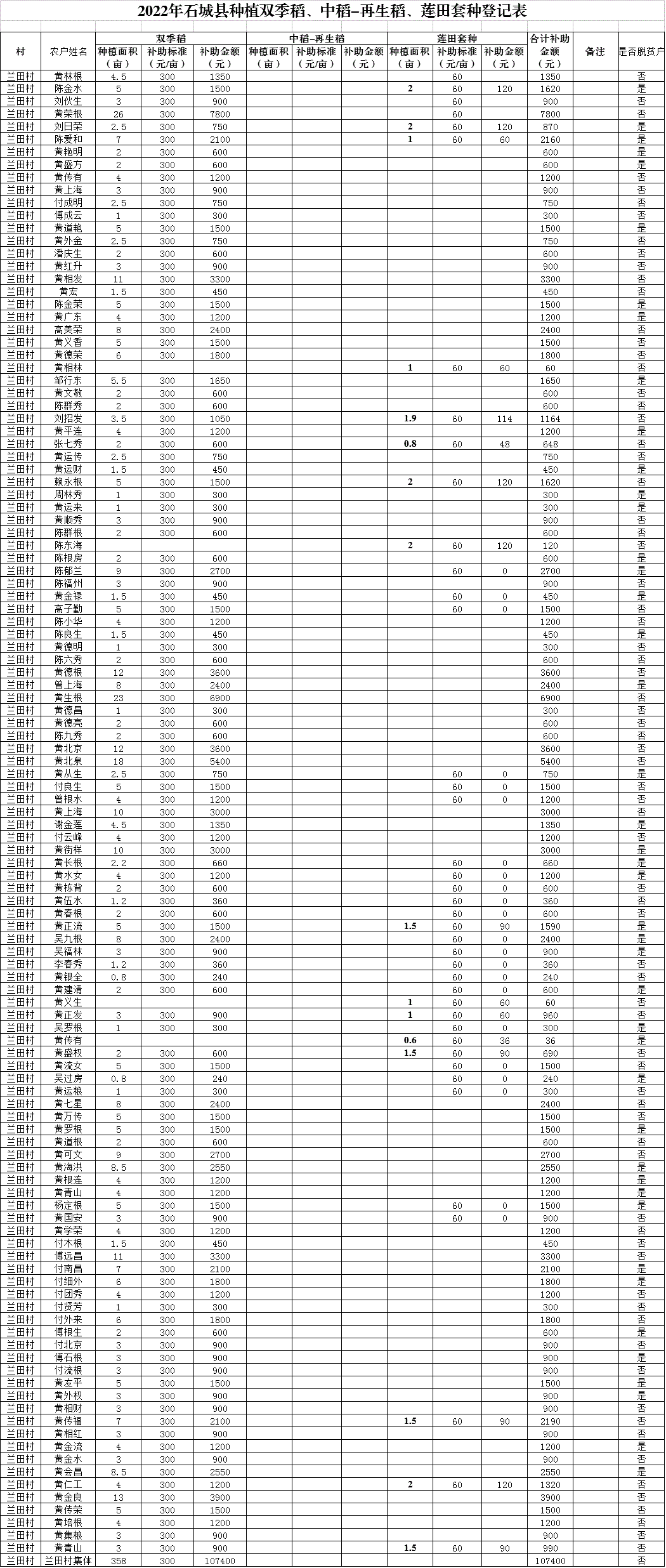 2022年石城縣大由鄉(xiāng)蘭田村種植雙季稻、中稻-再生稻、蓮田套種登記表