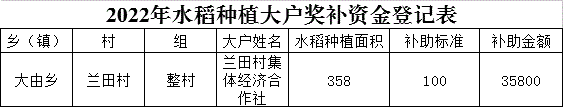 大由鄉(xiāng)蘭田村2022年水稻種植大戶獎補(bǔ)資金登記表