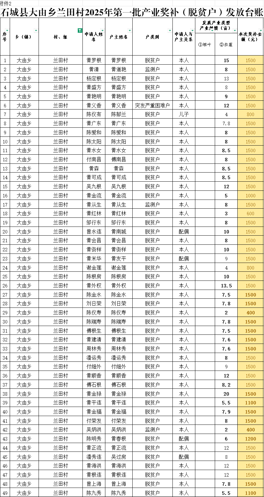 石城縣大由鄉(xiāng)蘭田村2025年產(chǎn)業(yè)獎補(脫貧戶)發(fā)放臺賬