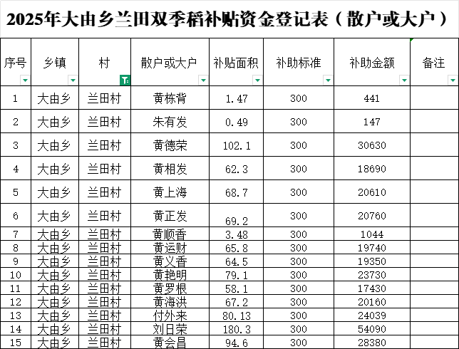 2025年大由鄉(xiāng)蘭田雙季稻補貼資金登記表(散戶或大戶)