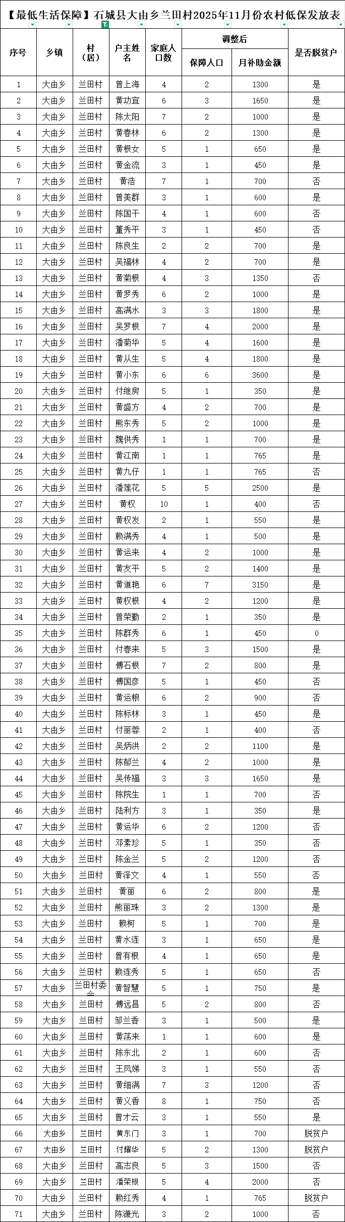 【最低生活保障】石城縣大由鄉(xiāng)蘭田村2025年11月份農(nóng)村低保發(fā)放表