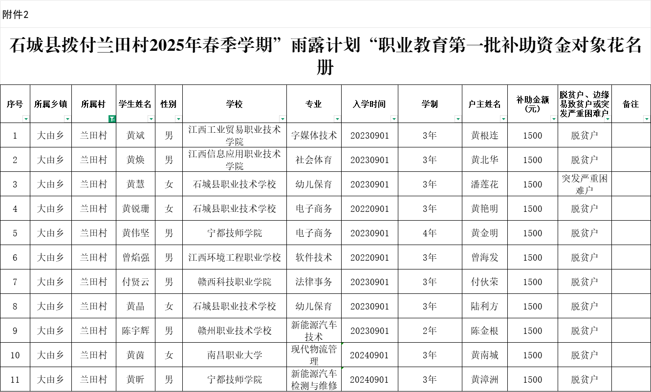 石城縣撥付蘭田村2025年春季學(xué)期”雨露計(jì)劃“職業(yè)教育第一批補(bǔ)助資金對象花名冊