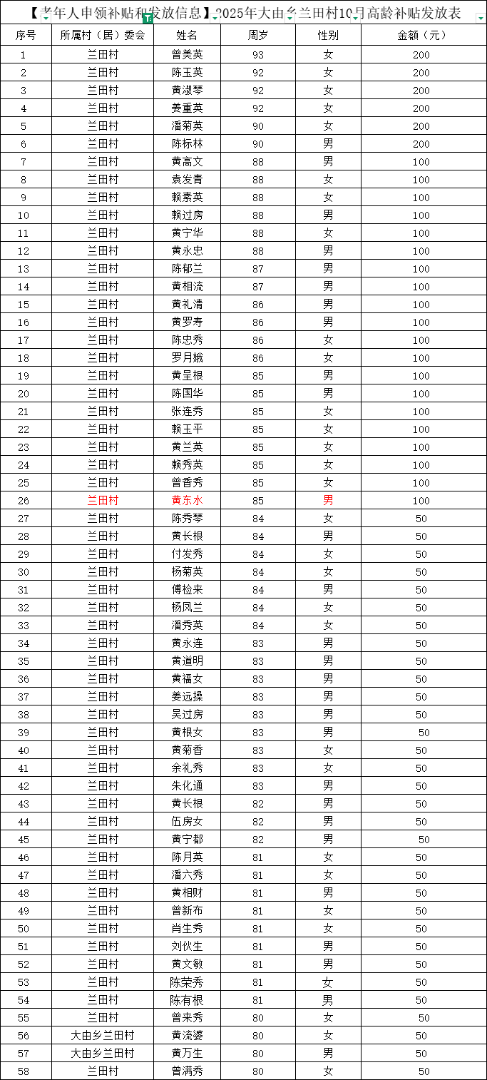 【老年人申領補貼和發(fā)放信息】2025年大由鄉(xiāng)蘭田村10月高齡補貼發(fā)放表