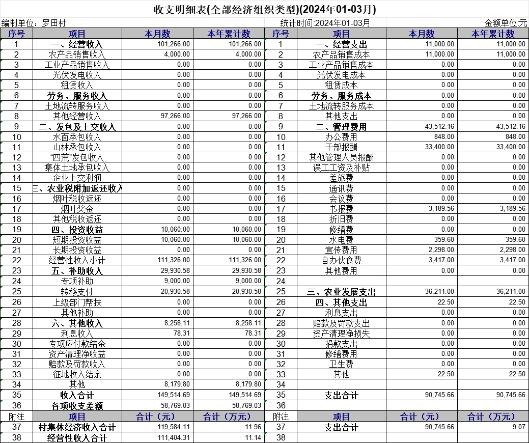 大由鄉(xiāng)羅田村2024年1-3月收支明細