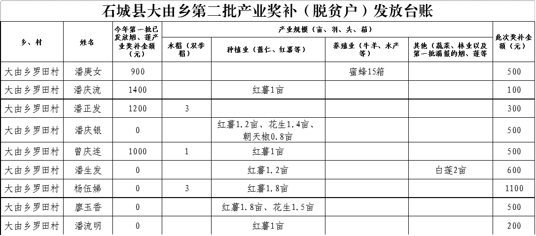 石城縣大由鄉(xiāng)羅田村第二批產(chǎn)業(yè)獎補(脫貧戶)發(fā)放臺賬