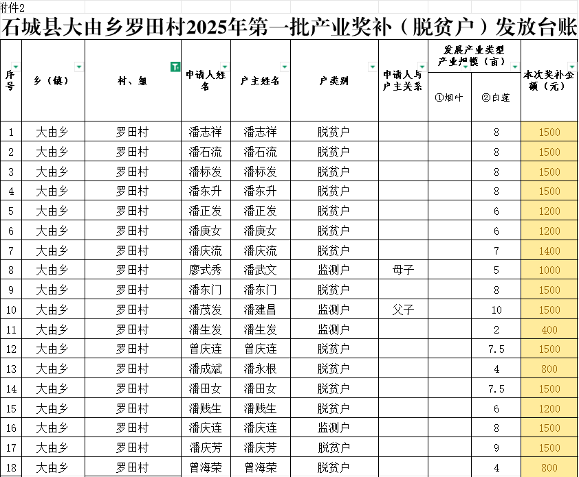 石城縣大由鄉(xiāng)羅田村2025年第一批產(chǎn)業(yè)獎(jiǎng)補(bǔ)(脫貧戶)發(fā)放臺(tái)賬