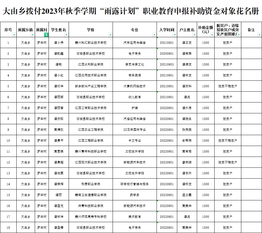 大由鄉(xiāng)羅田村撥付2023年秋季學(xué)期“雨露計劃”職業(yè)教育申報補助資金對象花名冊