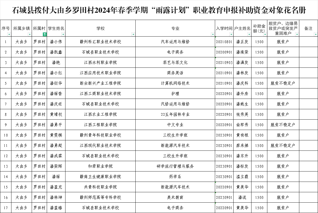 石城縣撥付大由鄉(xiāng)羅田村2024年春季學(xué)期“雨露計(jì)劃”職業(yè)教育申報(bào)補(bǔ)助資金對象花名冊