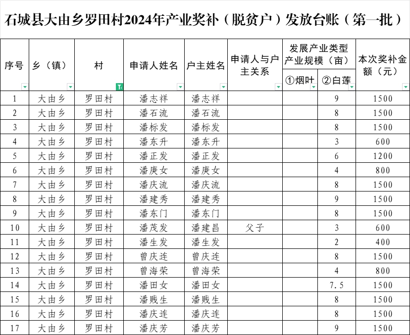 石城縣大由鄉(xiāng)羅田村2024年產(chǎn)業(yè)獎(jiǎng)補(bǔ)(脫貧戶)發(fā)放臺賬(第一批)