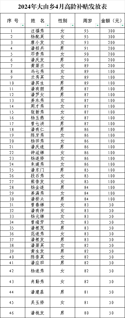 2024年大由鄉(xiāng)羅田村4月高齡補(bǔ)貼發(fā)放表