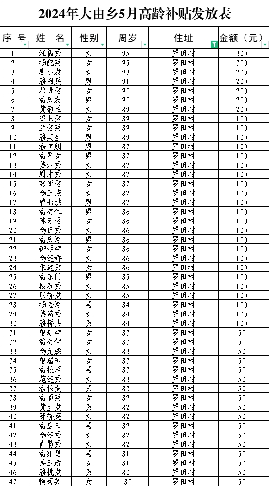 2024年大由鄉(xiāng)羅田村5月高齡補(bǔ)貼發(fā)放表
