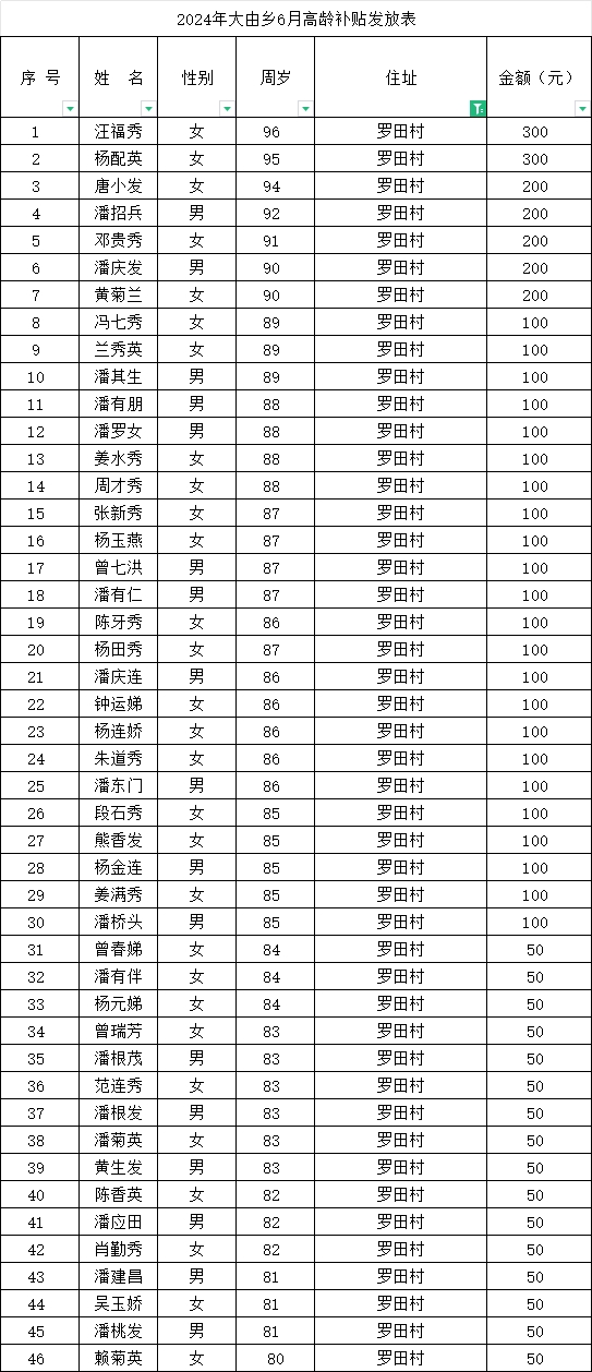 2024年大由鄉(xiāng)羅田村6月高齡補(bǔ)貼發(fā)放表