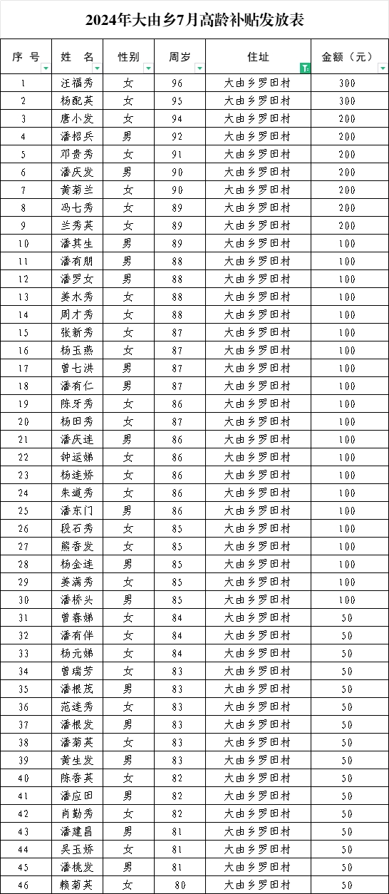2024年大由鄉(xiāng)羅田村7月高齡補(bǔ)貼發(fā)放表