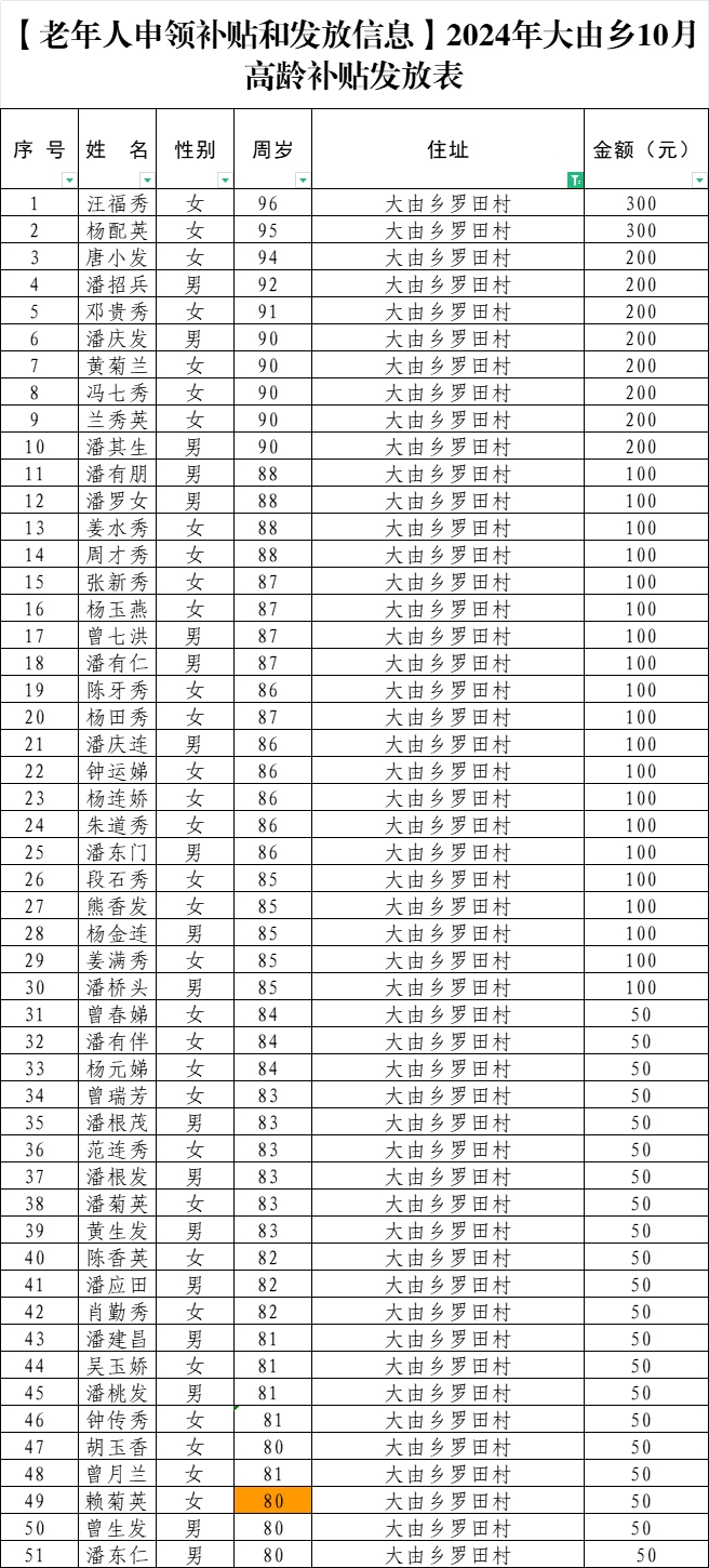 【老年人申領(lǐng)補貼和發(fā)放信息】2024年大由鄉(xiāng)羅田村10月高齡補貼發(fā)放表