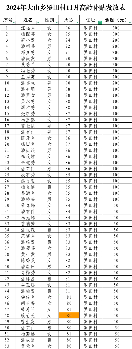 【老年人申領(lǐng)補(bǔ)貼和發(fā)放信息】2024年大由鄉(xiāng)羅田村11月高齡補(bǔ)貼發(fā)放表