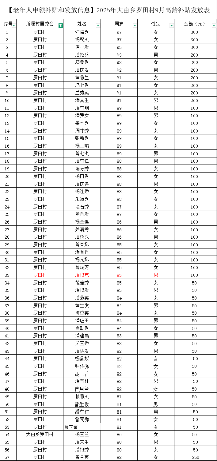 【老年人申領(lǐng)補(bǔ)貼和發(fā)放信息】2025年大由鄉(xiāng)羅田村9月高齡補(bǔ)貼發(fā)放表
