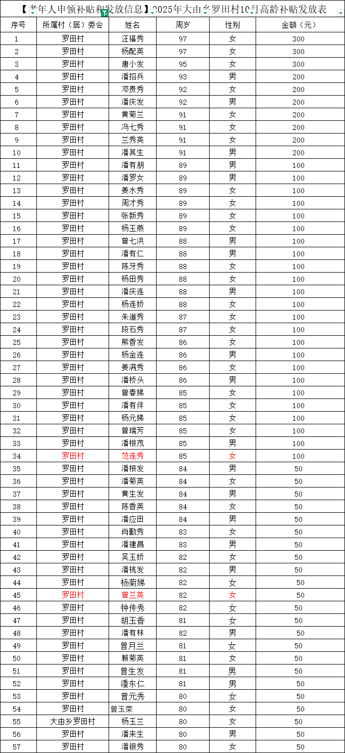 【老年人申領(lǐng)補貼和發(fā)放信息】2025年大由鄉(xiāng)羅田村10月高齡補貼發(fā)放表