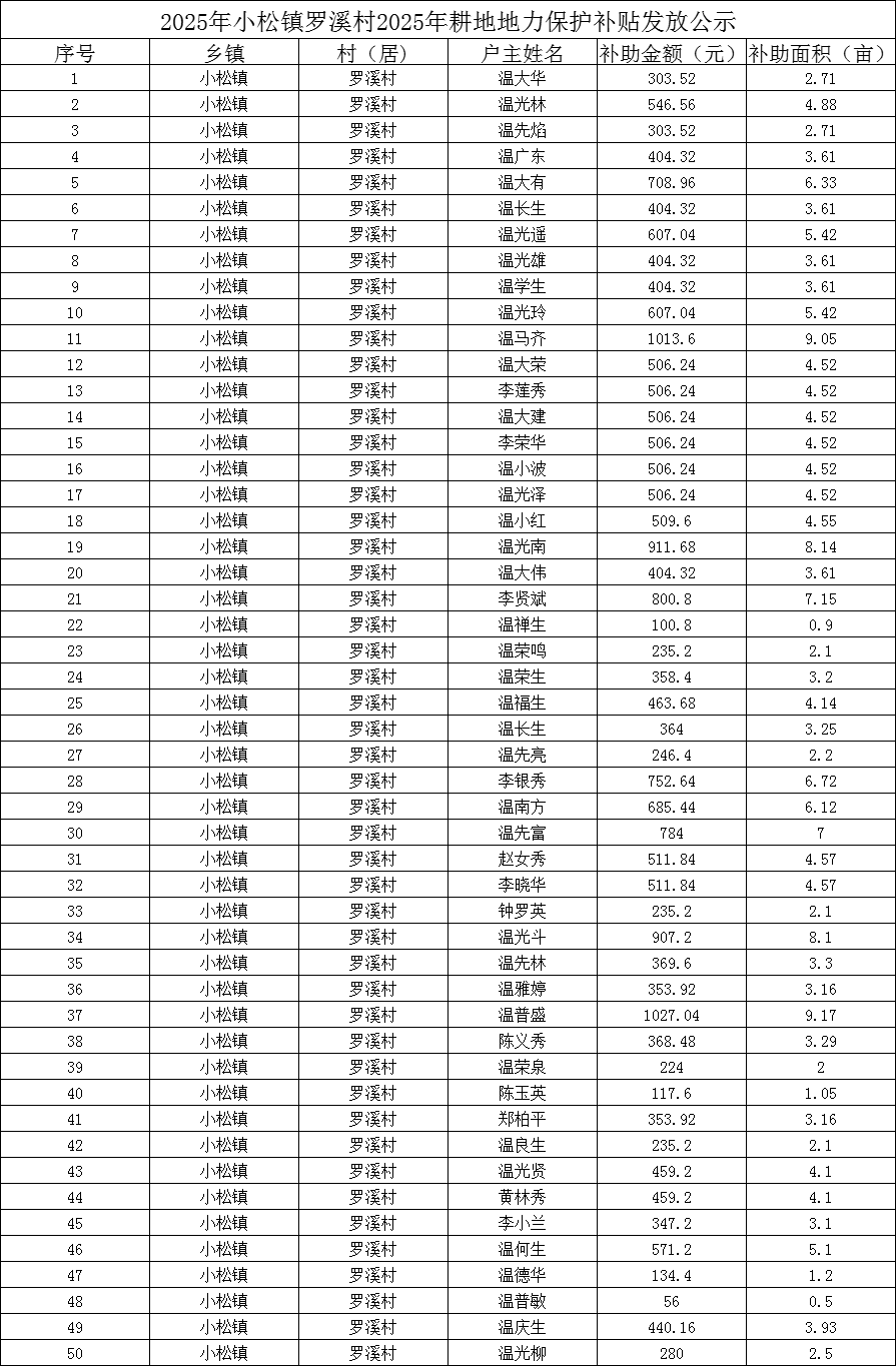 【惠農(nóng)補貼】小松鎮(zhèn)羅溪村2025年耕地地力保護補貼發(fā)放公示