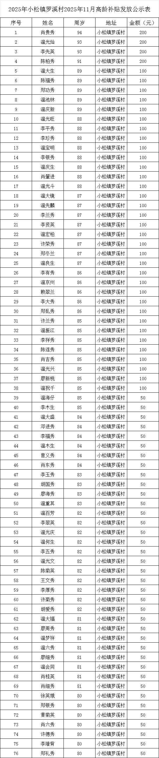 【老年人申領(lǐng)補(bǔ)貼和發(fā)放信息】石城縣小松鎮(zhèn)羅溪村2025年11月高齡補(bǔ)貼發(fā)放公示表