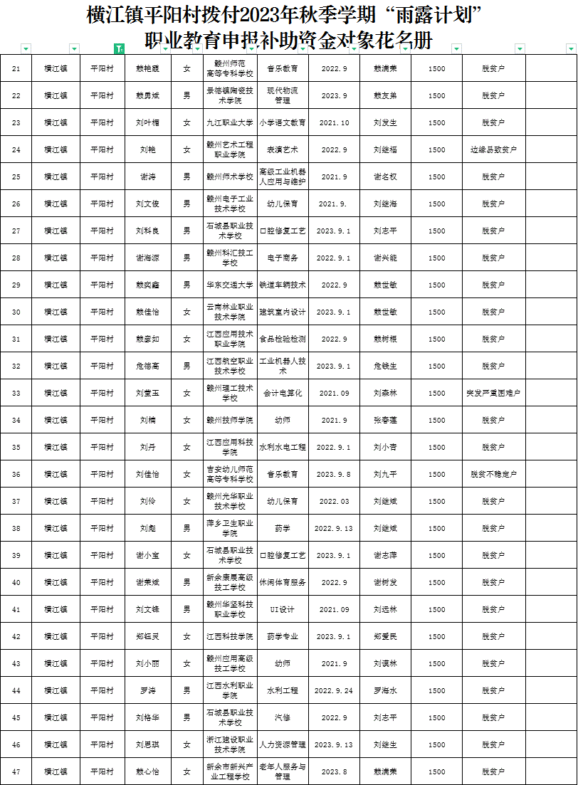 橫江鎮(zhèn)平陽村撥付2023年秋季學(xué)期“雨露計劃”職業(yè)教育申報補助資金對象花名冊