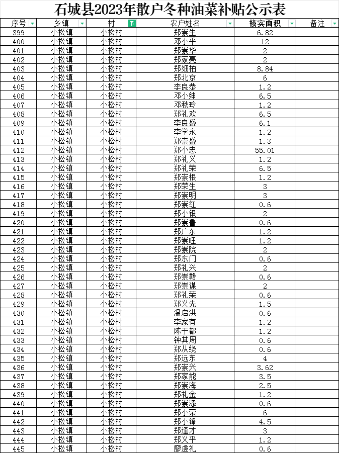 【涉農(nóng)補(bǔ)貼】石城縣小松鎮(zhèn)小松村2023年冬種油菜補(bǔ)貼公示表