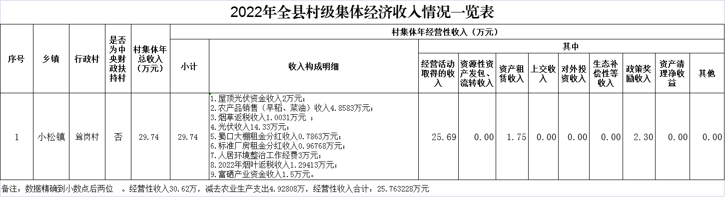 【集體統(tǒng)一經(jīng)營的經(jīng)營性資產(chǎn)】聳崗村2022年度集體經(jīng)濟(jì)收入情況公示表