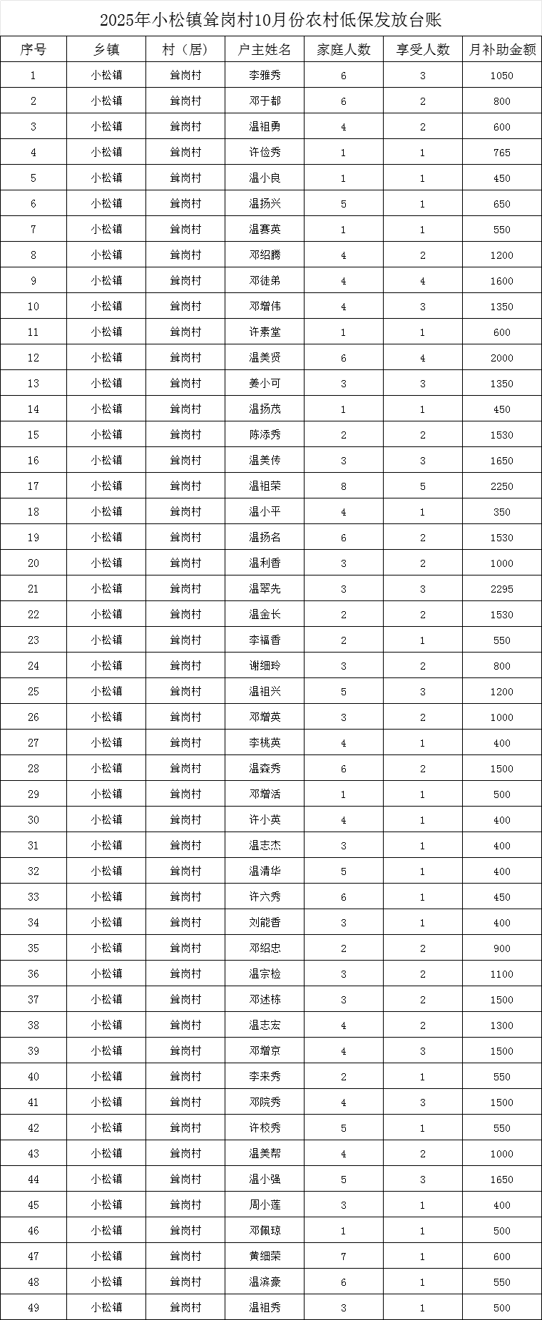 【最低生活保障】小松鎮(zhèn)聳崗村2025年10月農(nóng)村低保發(fā)放公示