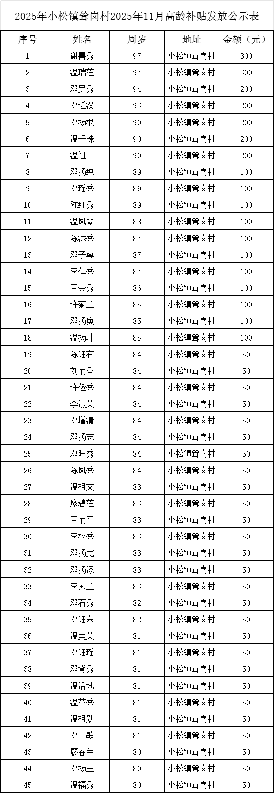 【老年人申領(lǐng)補貼和發(fā)放信息】石城縣小松鎮(zhèn)聳崗村2025年11月高齡補貼發(fā)放公示表
