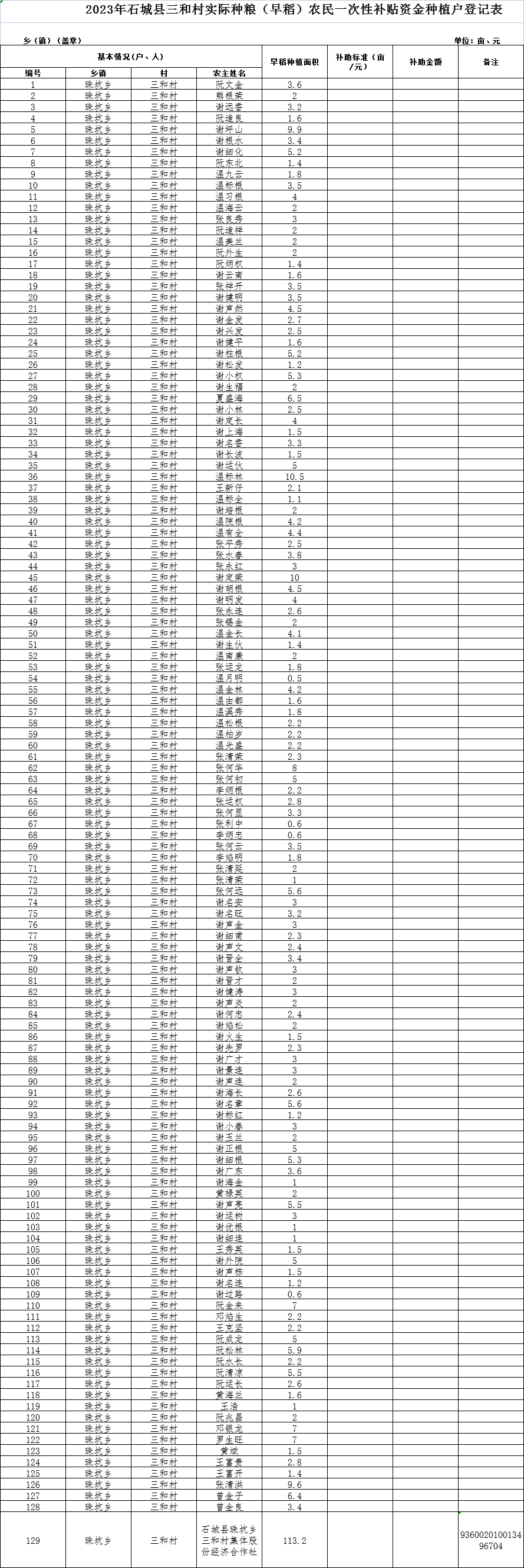 【涉農(nóng)補(bǔ)貼】 2023年石城縣三和村實(shí)際種糧(早稻)農(nóng)民一次性補(bǔ)貼資金種植戶登記表