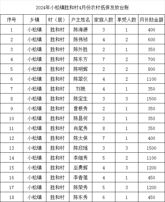 【最低生活保障】小松鎮(zhèn)勝和村2024年4月農(nóng)村低保發(fā)放公示