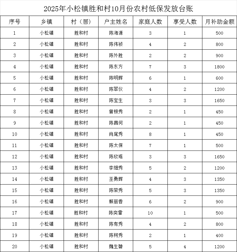 【最低生活保障】小松鎮(zhèn)勝和村2025年10月農(nóng)村低保發(fā)放公示
