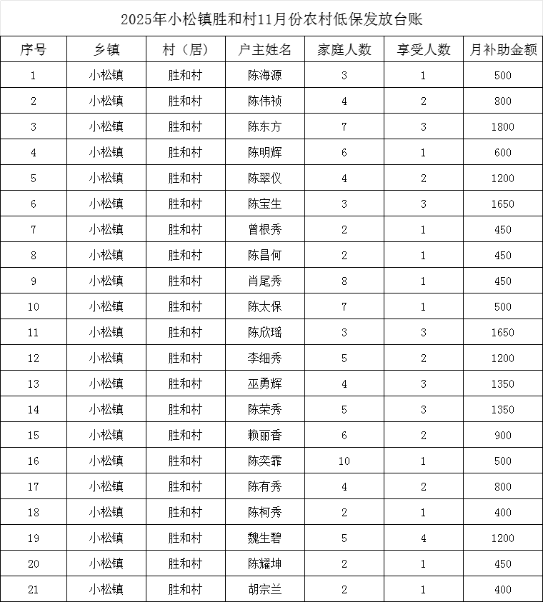 【最低生活保障】小松鎮(zhèn)勝和村2025年11月農(nóng)村低保發(fā)放公示